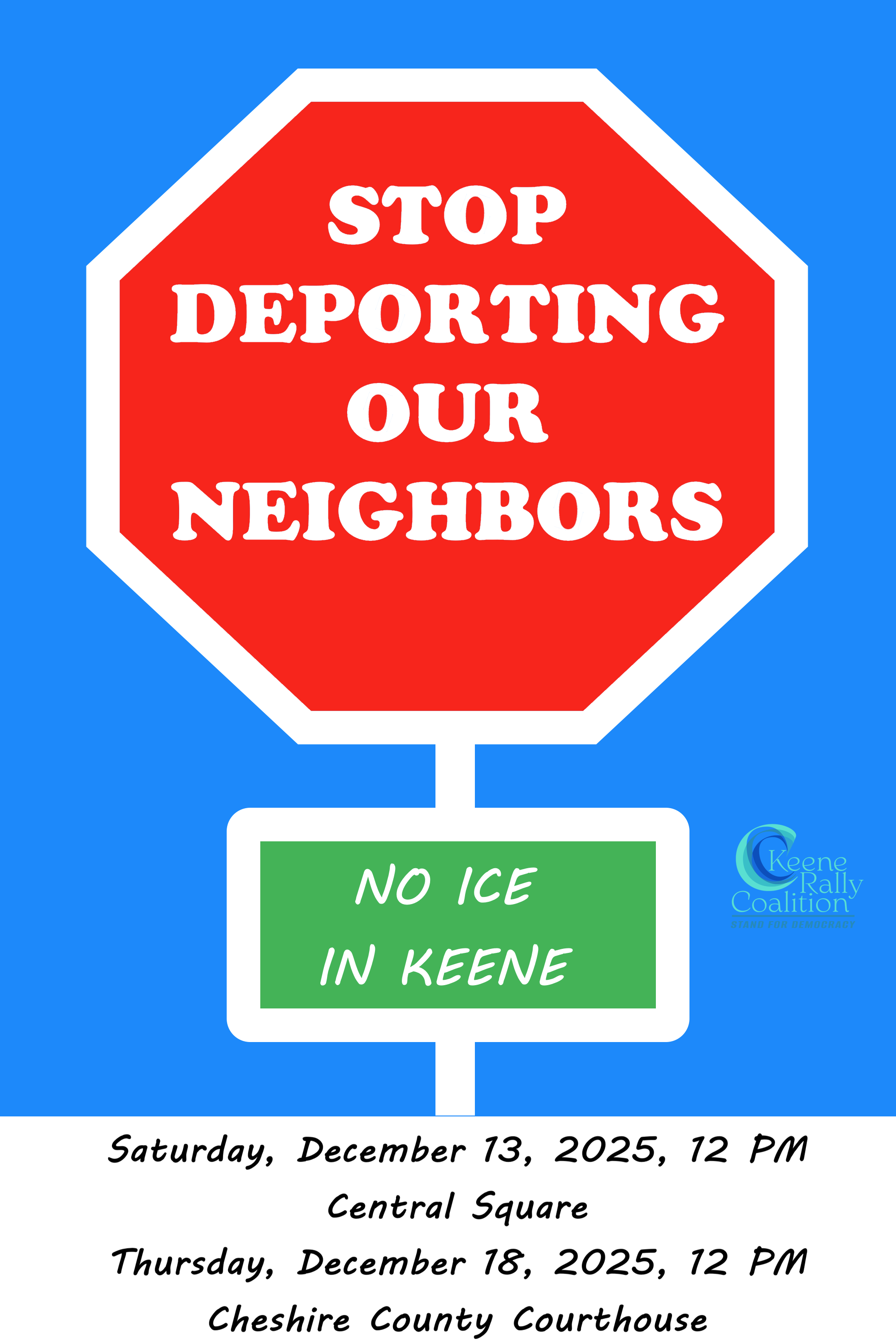 Here in Keene, there will be a peaceful rally on Sat. Dec. 13th from 12-1 on Central Square. On Thurs. Dec. 18th from 12-1 there will be a peaceful rally outside of Cheshire County Courthouse. There has been information recently publicized about the presence of ICE in our community. https://www.keenesentinel.com/news/local/troy-nh-police-making-immigration-arrests-under-agreement-with-feds/article_bb458eef-2c98-4c39-a68e-f39f1da85b14.html