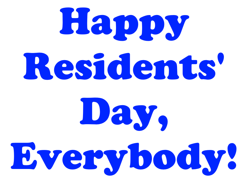Residents' Day is cool new holiday I just invented. It happens on the same day as President's Day but it has one fewer letters, and it celebrates all the awesome people we have here in the United States of America.