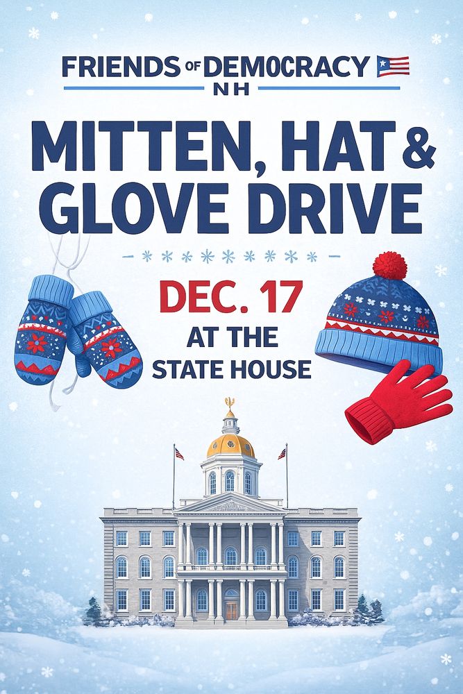 Friends of Democracy NH, and members of the New Hampshire Democrat House Caucus are organizing a Mitten, Hat, Glove, Scarf drive. Clean socks and coats will also be accepted. New or gently used items are greatly appreciated.